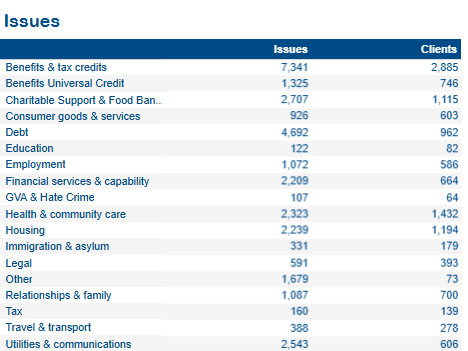 Our teams supported clients with housing, employment, relationship, consumer immigration and utilities queries throughout the year. This table shows the full range. And of course, people also used our website to get information on the problems they are facing.
